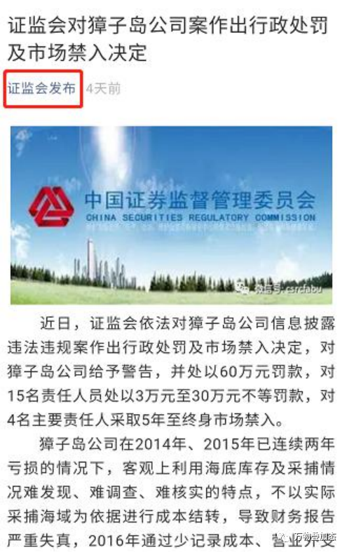 证监会最终对獐子岛公司给予警告,并处以60万元罚款,对15名责任人员处以3万元至30万元不等罚款,对4名主要责任人采取5年至终身市场禁入。