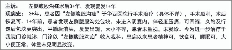 住院病案主诉写了 “左侧腹股沟疝术后3+年,发现复发1+年”。