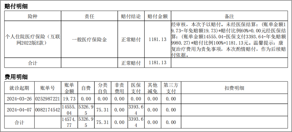 事实上,后面的理赔也很顺利,在线提交资料以后,第二天就赔下来了,个人实际承担的11181.13元减去1万免赔额后,剩余部分都赔了。